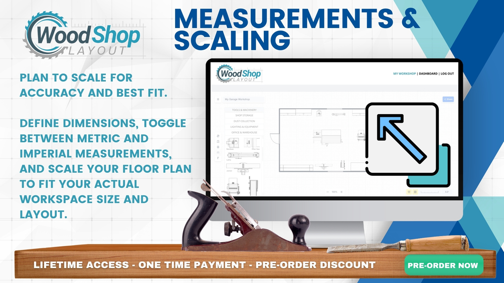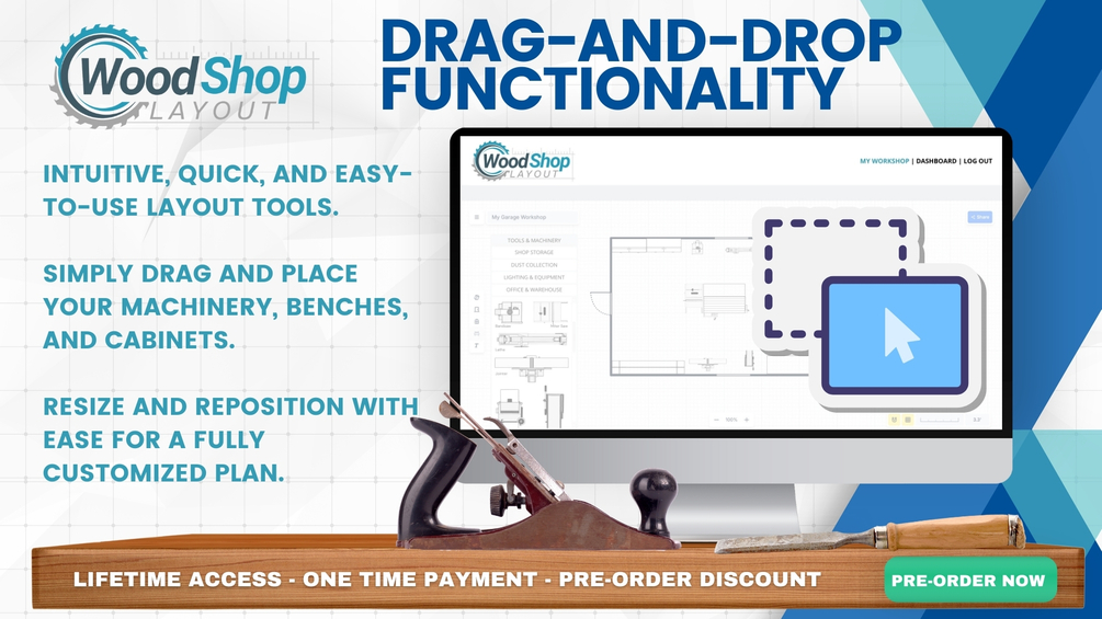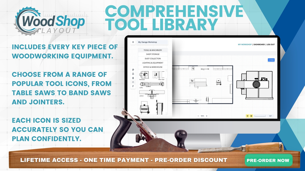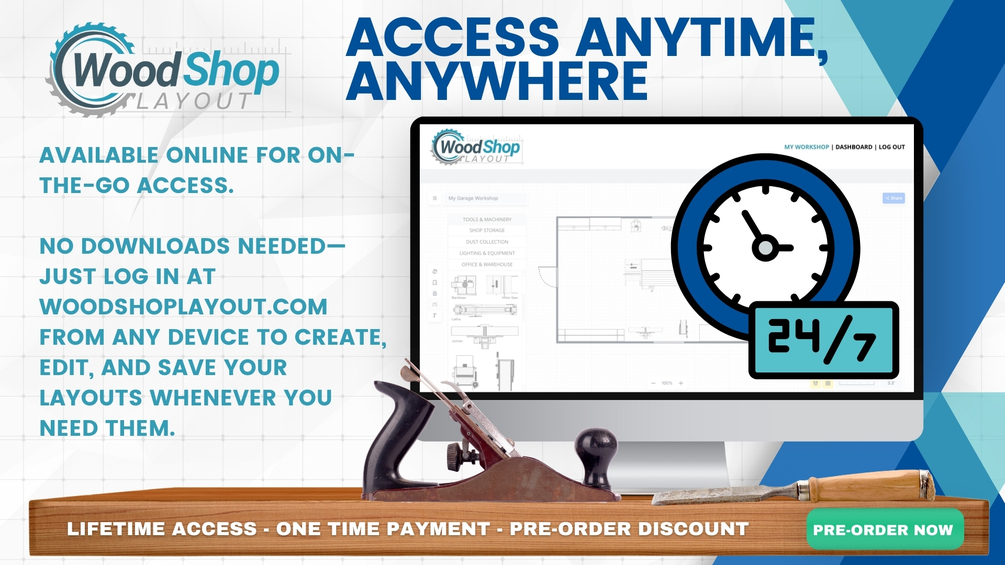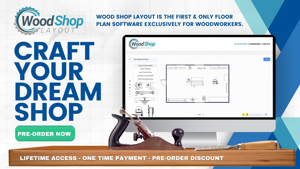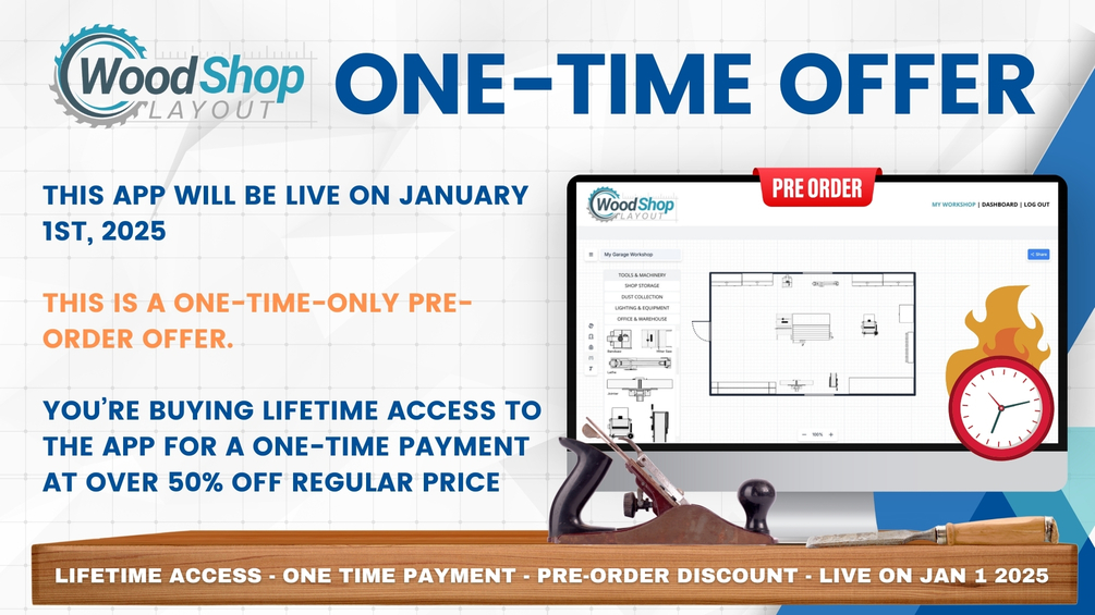 Launch Date: January 1st Secure lifetime access at the exclusive pre-order price of $37 (retail $99 after launch) and be among the first to create your ideal woodworking space with Wood Shop Layout. Whether you’re setting up a new shop or optimizing an existing layout, our online tool is designed to help you craft an efficient, organized workspace tailored to your unique workflow and equipment. Pre-Order Price: $37 Lifetime Access — No subscriptions or recurring fees. After January 1st, the price will increase to $99 for lifetime access, so pre-order now to lock in your savings!